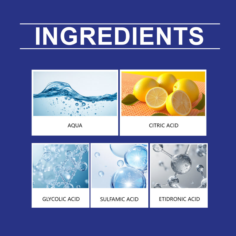 Ingrédients principaux : Eau, Acide citrique, Acide amidosulfonique, Acide glycolique, Acide hydroxyéthylidène diphosphonique