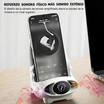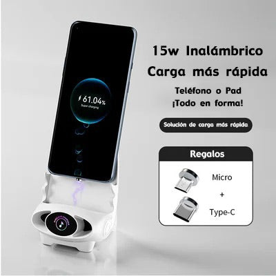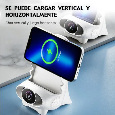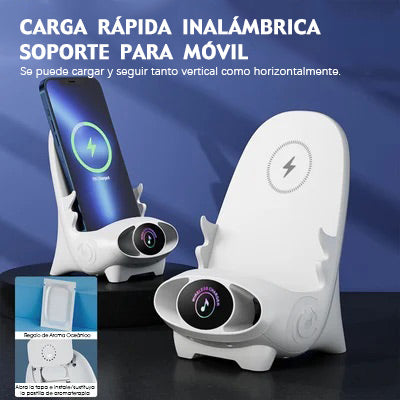 Único y novedoso, la función de carga inalámbrica/soporte para teléfono móvil se puede colocar en horizontal o vertical, y hay un orificio de sonido en la parte inferior para que el sonido sea más tridimensional cuando el teléfono está sonando.